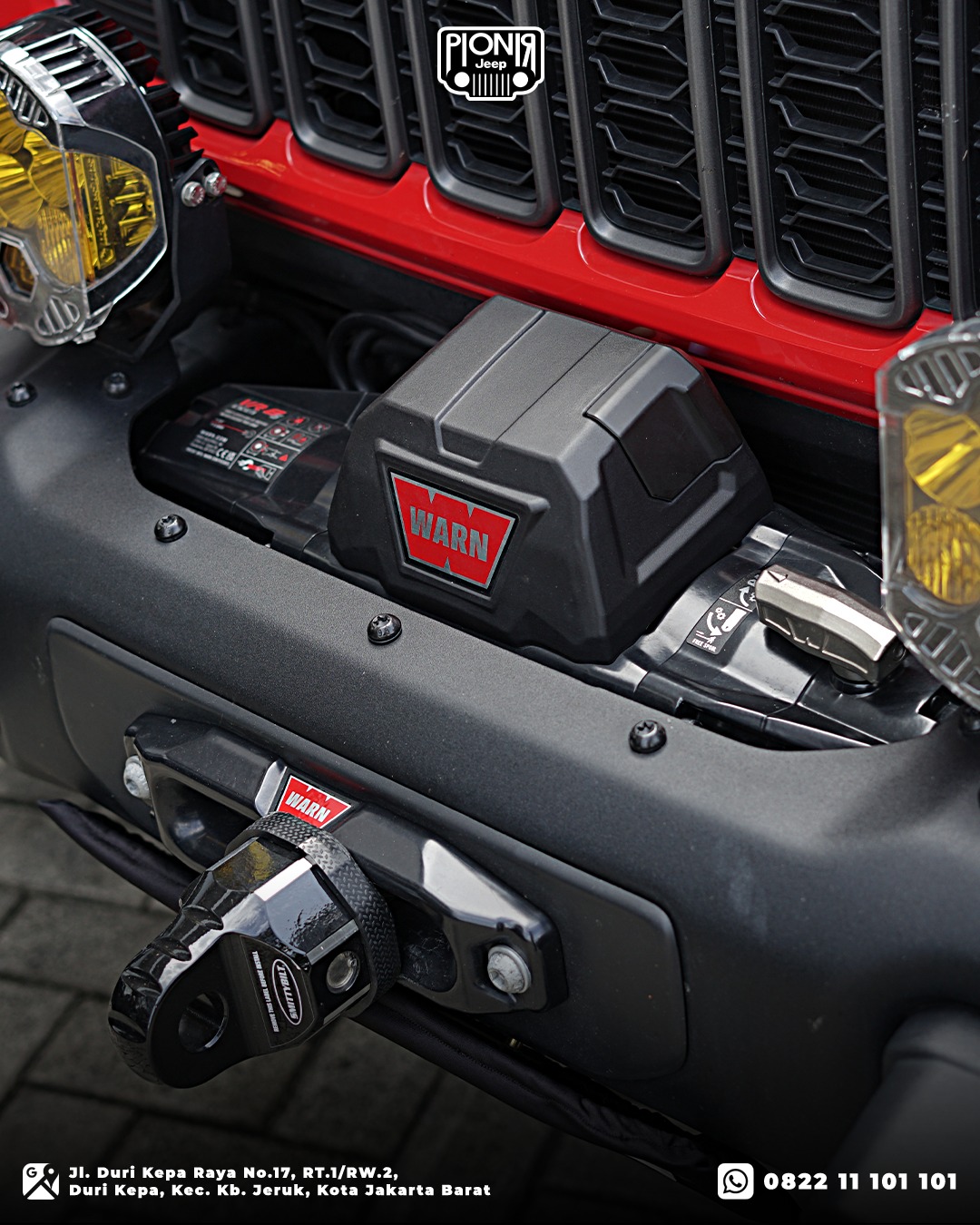 - Winch Warn VR Evo 8s – Winch elektrik yang kuat untuk menarik kendaraan lain atau membantu Jeep keluar dari medan sulit.