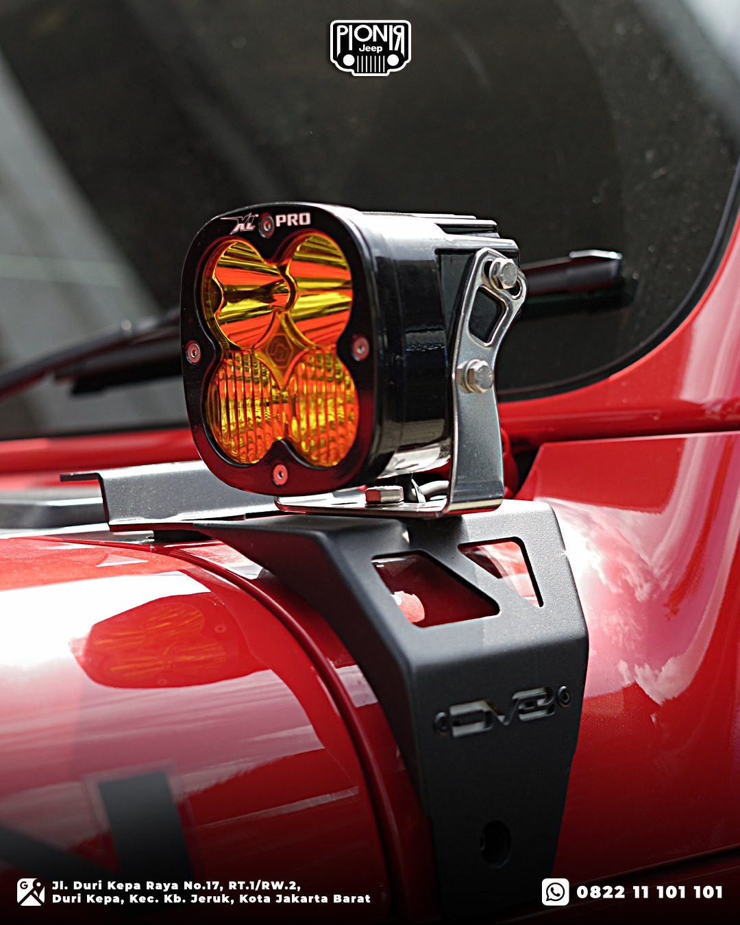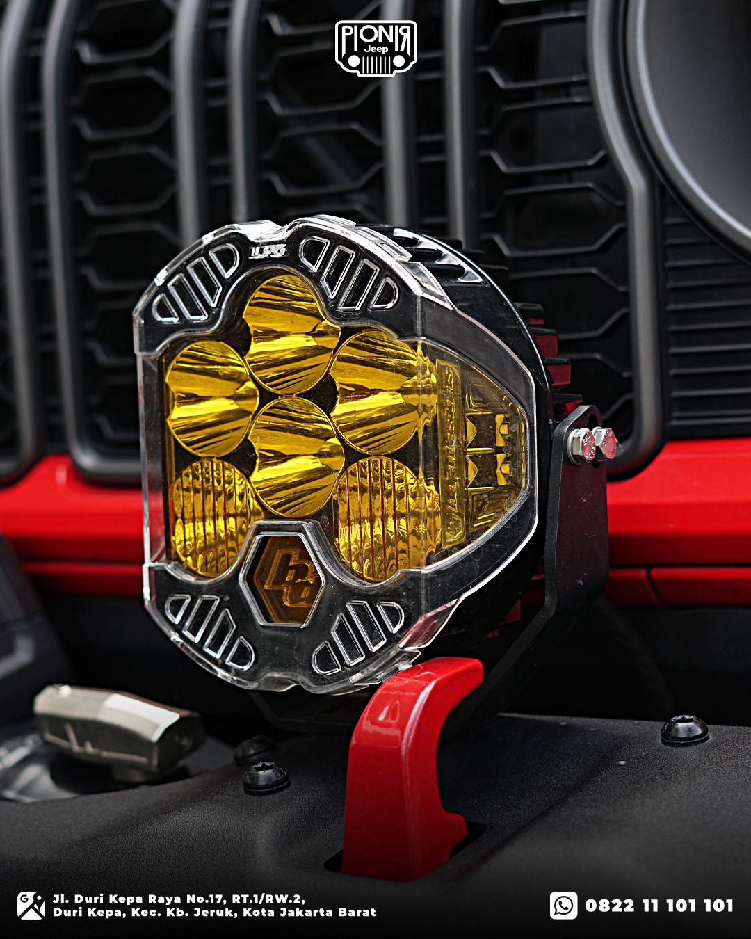 - Lampu Baja Designs XL Pro di pillar A – Pencahayaan ekstra untuk estetika dan keamanan di sisi Jeep.